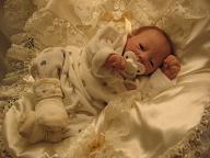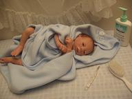 Pientä päätä on tuettava, kuten oikeillakin näin pienillä vauvoilla. Tutin pitää suussa magneetti.