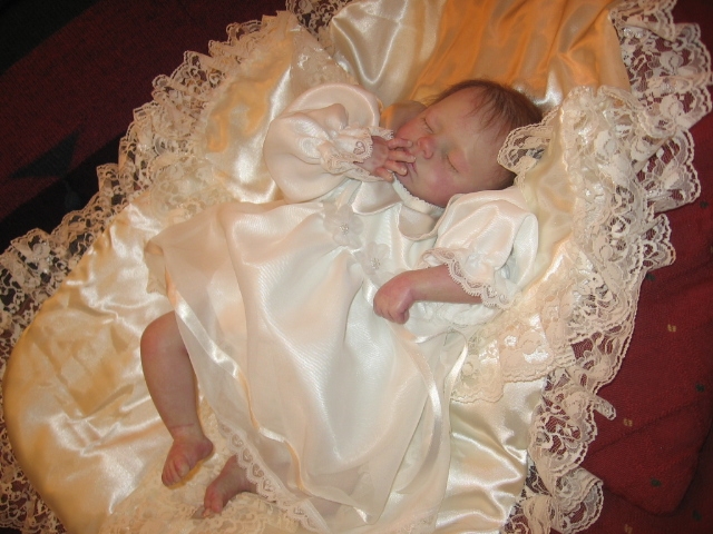 Fanni syntynyt: klo 9.00, 24.11.2006 paino: 1800 g pituus: 45 cm Fanni on muokattu laadukkaasta nukkeaihiosta, jolla on sisäänrakennettu hengitysmekanismi. Katso tästä miten Fannin rintakehä kohoilee nukkuessa! :) (Laita myös kaiuttimet päälle.) Fannin hiukset on istutettu hienoisesta mohairista ja tuntuvat oikean vauvan hiuksilta. Silmäripset on istutettu samasta mohairista ja sinetöity sisäpuolelta, kuten hiuksetkin. Värjäys on tehty Real Effect-väreillä. Klikkaamalla kuvia näet ne suurempina |